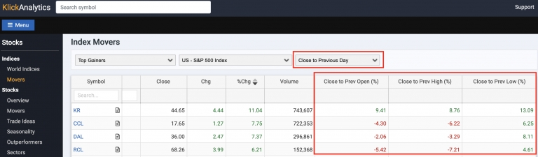 To access: Click on Menu > Movers > Click on drop down 'Main' and then select 'Close to Previous Day'
