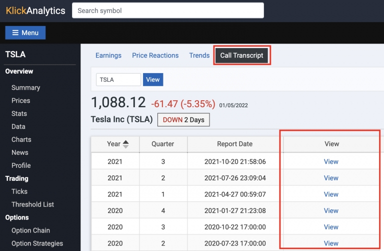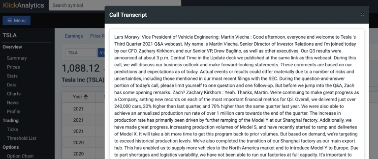 KlickAnalytics provides call scripts from 2006 onwards for companies. Now our users can access all the earnings call transcripts to see actual call details for even further analysis. To access: Search for a company say TSLA, and then from the left symbol menu > Earnings > Call Transcript