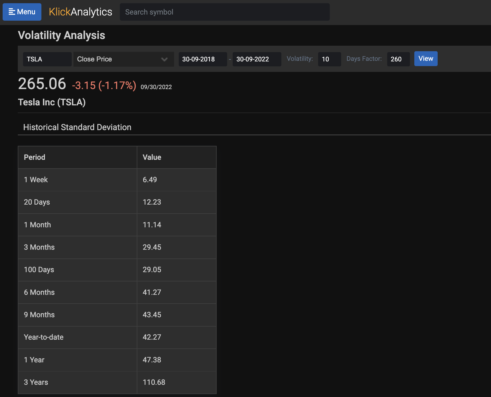 KlickAnalytics calculates a lot of derived data from market data. We just updated our volatility app to include historical standard deviations with the following periods;